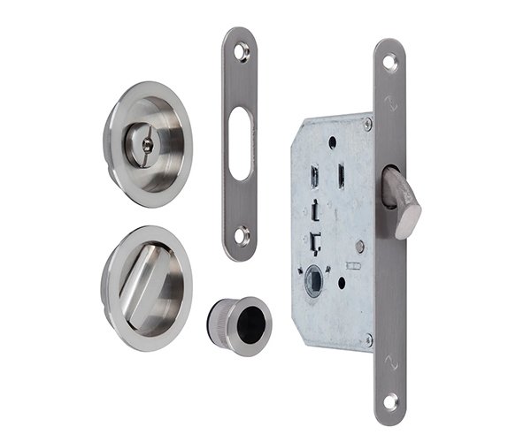 KIT for standard sliding door with round handle, bolt and lock, strike plate and front handle. With a filler.